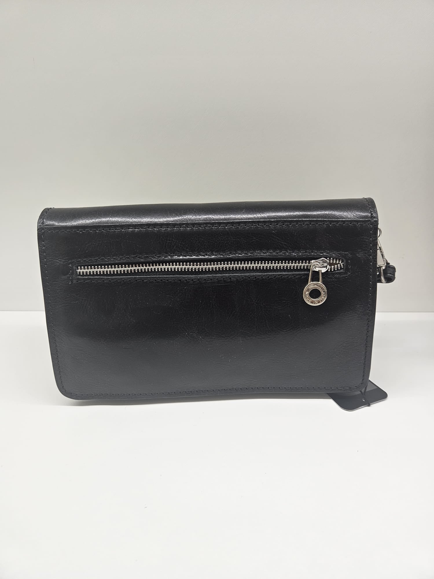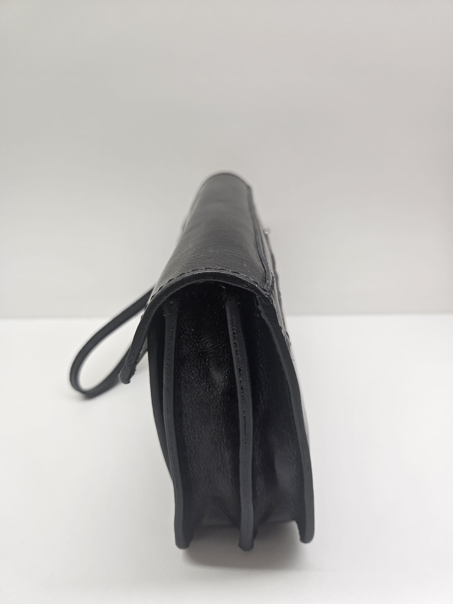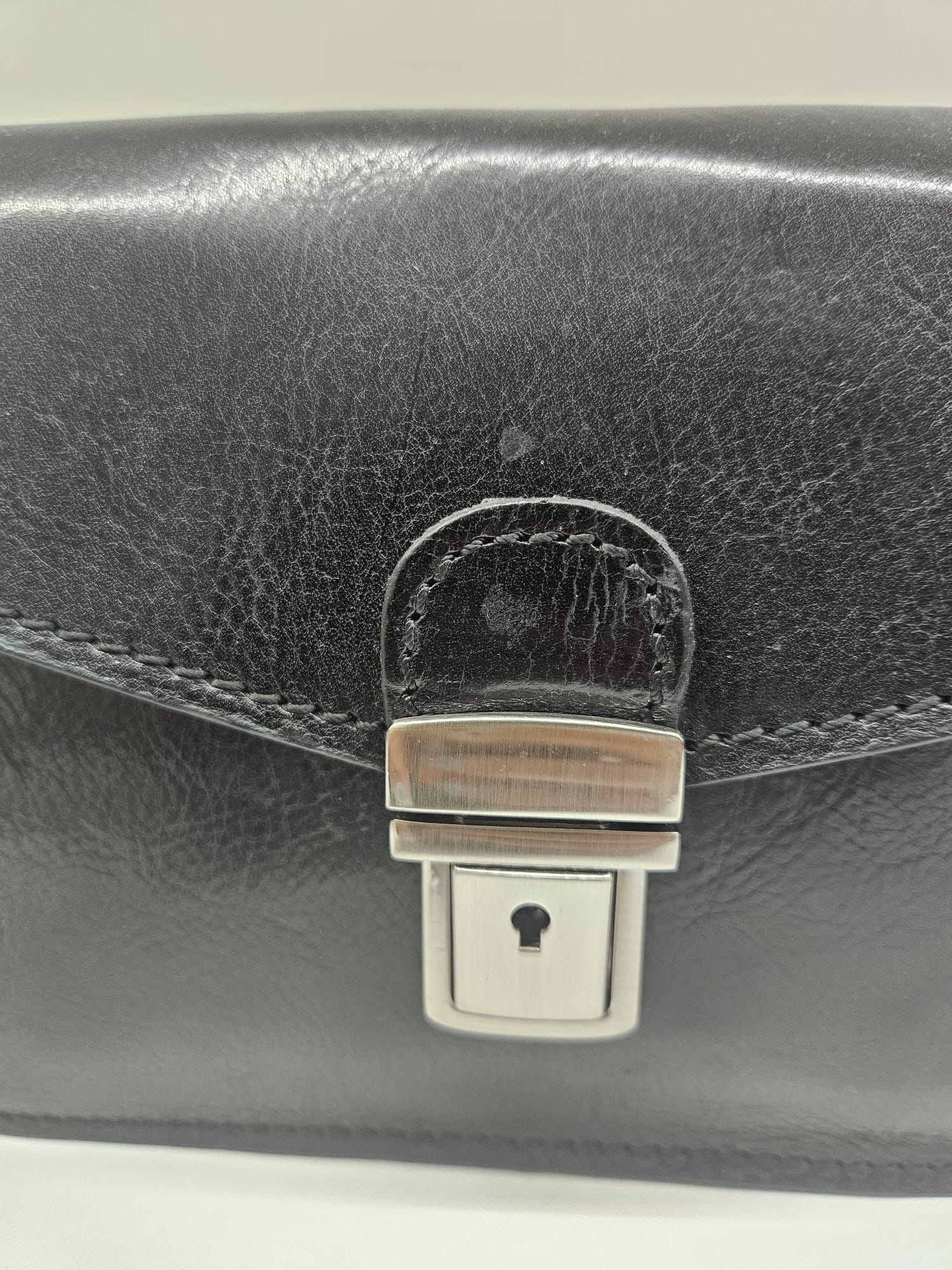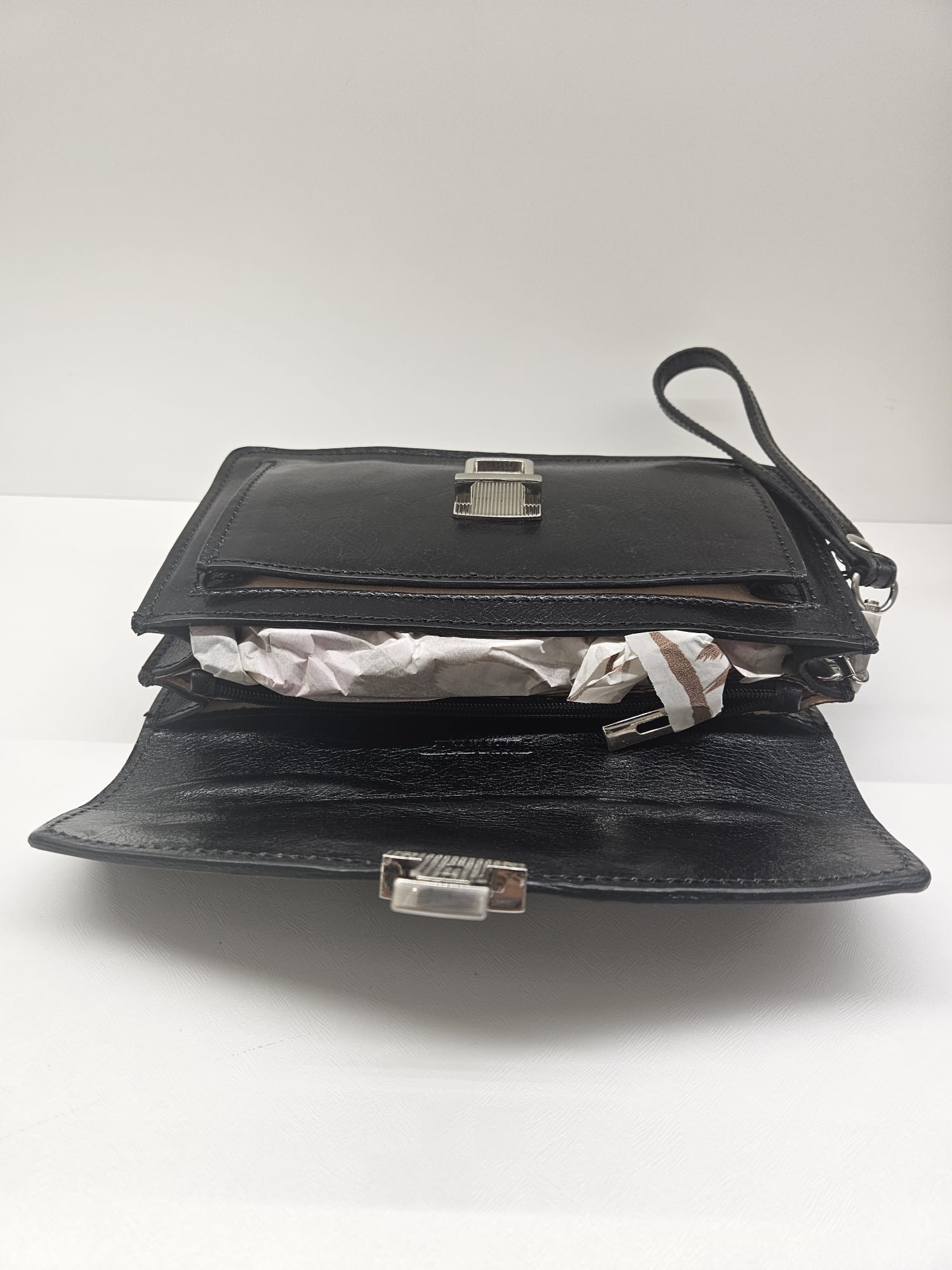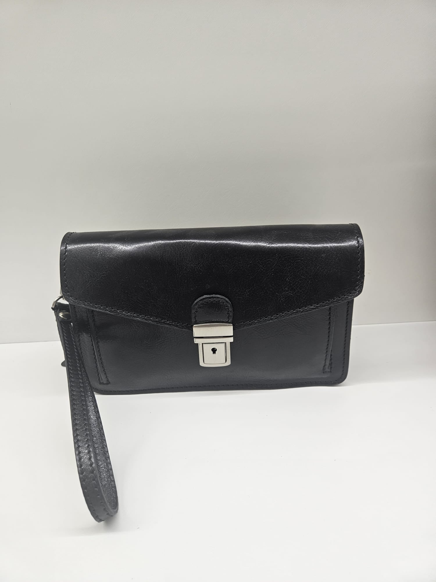 Borsello a mano uomo in pelle vacchetta con chiusura clips in metallo.