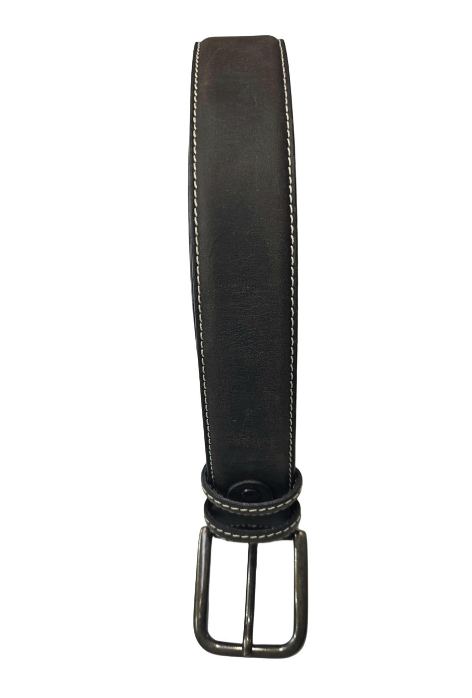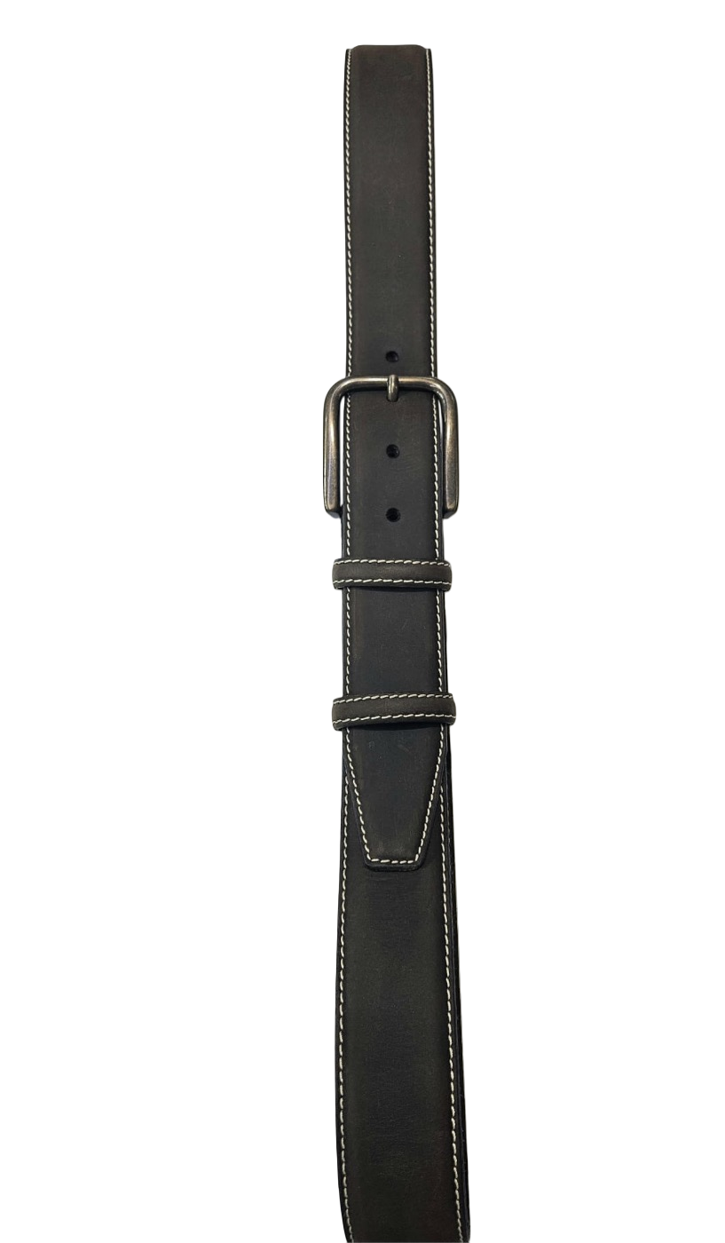 Cintura jeans uomo in pelle di toro con cuciture a contrasto fibbia in colore ottone altezza cm4.